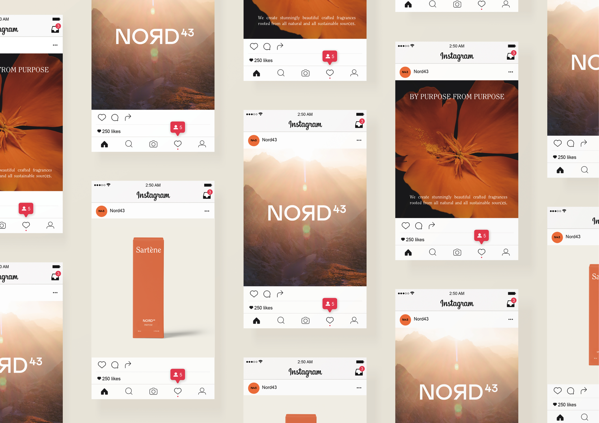 Nord43’s branding and identity system was strategically developed to reflect the brand’s core values of simplicity, sustainability, and elegance. Inspired by the natural beauty of Nice/France, the design merges purity and modernity with a minimalist and sophisticated aesthetic. The logo and cohesive visual language establish a distinctive, premium presence across digital and physical touchpoints, positioning Nord43 as a leader in masterfully crafted, sustainable fragrances for discerning global consumers.