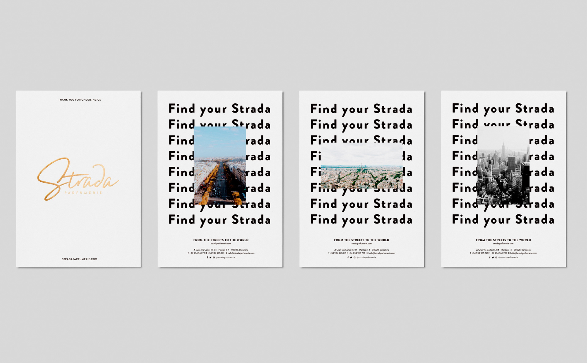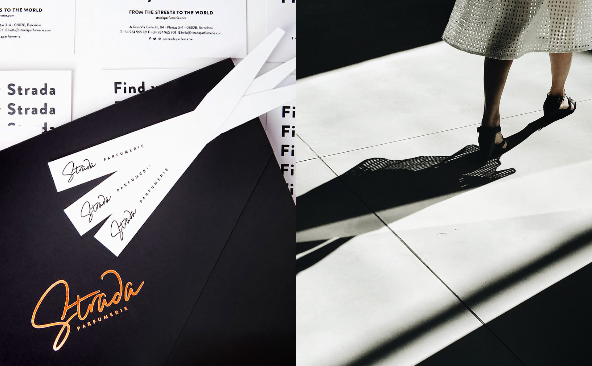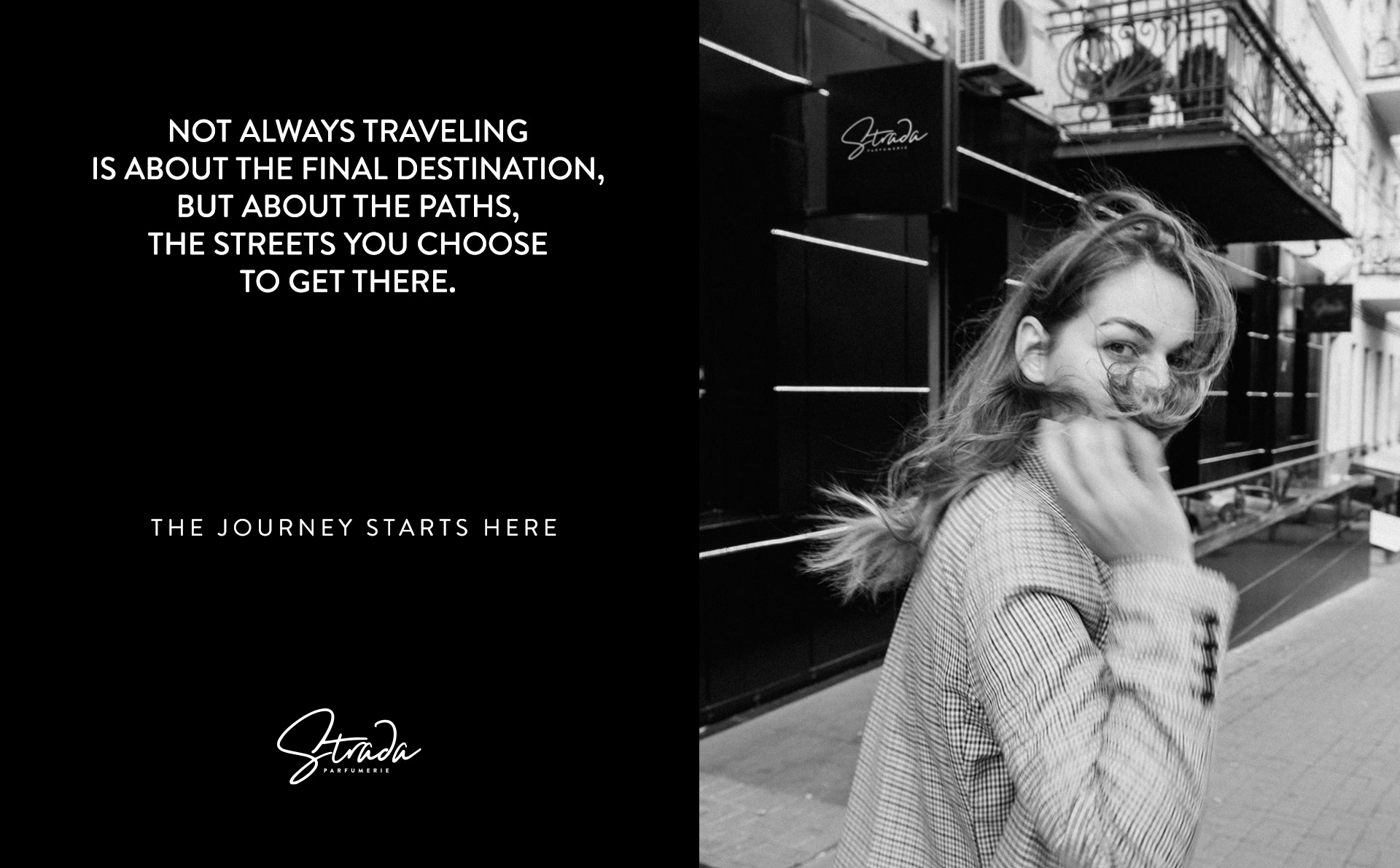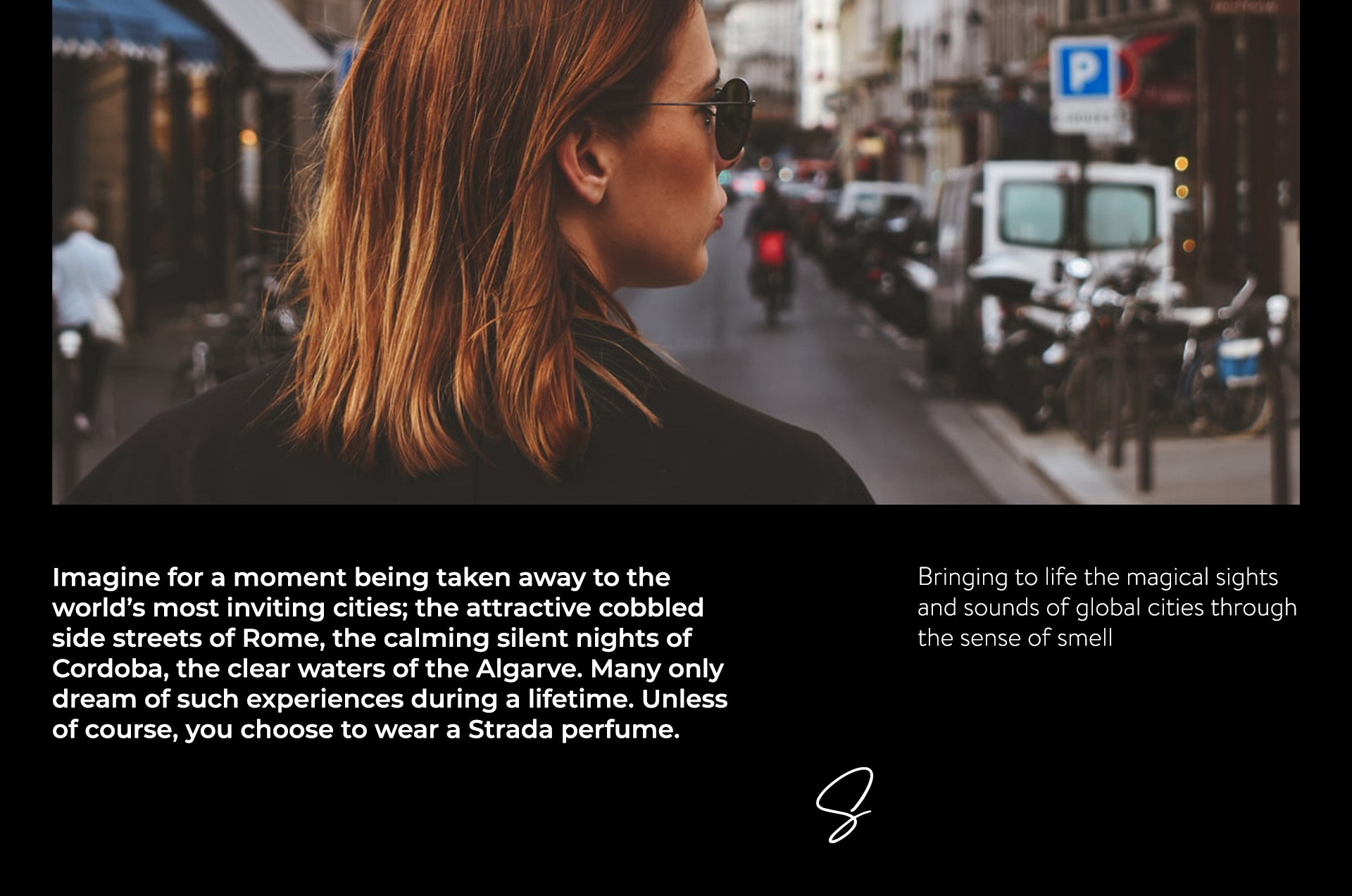Create a sophisticated perfume brand, “Strada,” capturing the essence of luxurious streets through minimalistic and elegant design.